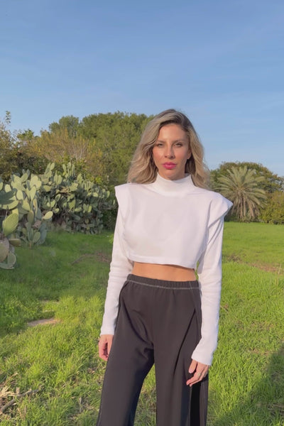כריות הכתפיים בונות קו כתף מודגש וישר, שמעניק לטופ מראה קוטורי ומדויק,